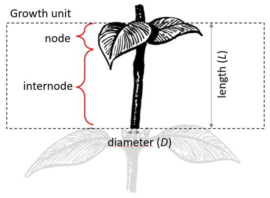 The mathematical model representing the growth dynamics of the virtual plant’s branches has been developed as a set of ordinary differential equations (ODEs). Each branch is divided into several growth units representing a single node/internode couple (Figure 1). The first two equations represent primary and secondary growth, i.e., the dynamics in time of length L and width D of each growth unit (Figure 1).