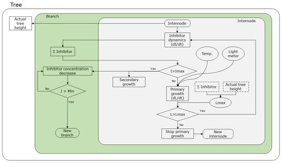 Proposed tree growth model scheme and relationships between modules. The blocks in the schematic represent the various functions of the modules, the rhombus blocks represent the function activation conditions (if statements in C# code).