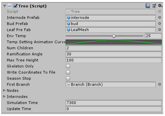 These settings are possible in Unity© modifying the variables of the script via the inspector (a built-in Unity© editor), Figure 4, or via scripting. According to the objectoriented programming paradigm, the other modules and sub-modules will descend from the tree script, inheriting the common characteristics. Each module that inherits from tree will have the same characteristics. For example, it will inherit the maximum height of the tree as a parameter. The tree module holds also lists of all branches, internodes and buds (nodes) of tree to process the tree structure hierarchy.