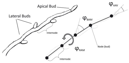 Nodes-internodes scheme of a branch with branching angles. is the bud rotation angle around internode axis; is the bud angle to internode axis; is the apical bud angle to internode axis.