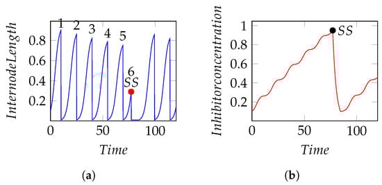 Internode length and Inhibitor concentration simulations in Simile as expected behaviour with fixed environmental parameters. SS = Season Stop. Numbers are the count of internodes. (a) Internode Length; (b) Inhibitor Concentration.