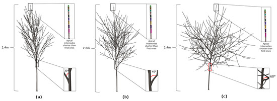 By changing the branching angle instead, the results obtained are shown in Figure 10. It can be seen that by changing the branching angle from 30° (Figure 10a) to 40° (Figure 10b) and 60° (Figure 10c), the tree widens the canopy and takes up more space. The heights are also different, respectively, 2.4 m for the trees with 30° and 60° branching angles, and 2.6 m for the tree with 40° branching angle.