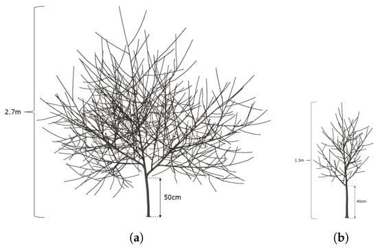 - Weber, J.; Penn, J. Creation and Rendering of Realistic Trees. In Proceedings of the 22nd Annual Conference on Computer Graphics and Interactive Techniques, SIGGRAPH ’95, Los Angeles, CA, USA, 6–11 August 1995; Association for Computing Machinery: New York, NY, USA, 1995; pp. 119–128. [Google Scholar] [CrossRef]