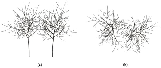 Group of 2 trees growing at 2 m distance. (a) Side view of 2 trees growing at 2 m distance; (b) Top view of 2 trees growing at 2 m distance.