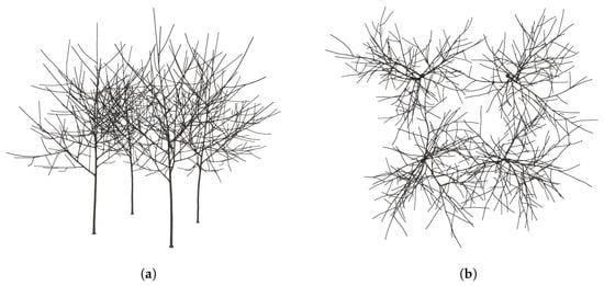 Group of 4 trees growing at 1 m distance. (a) Side view of 4 trees growing at 1 m distance; (b) Top view of 4 trees growing at 1 m distance.