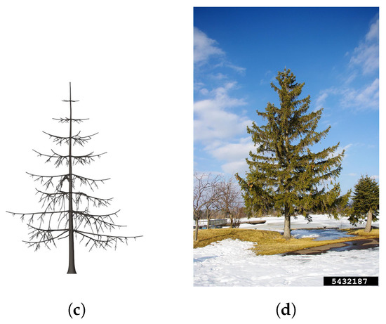 Visual comparison for different shape trees. (a,b) are columnar shaped trees; (c,d) are conical shaped trees. (a) Columnar shaped tree with branching angle equal to 45° and number of children set equal to 2; (b) Real photo of a Populus nigra for comparison. Photo courtesy of T. Davis Sydnor, The Ohio State University, Bugwood.org; (c) Conical shaped tree with branching angle of 90° for the primary branches, 55° for the secondary and tertiary branches and number of children equal to 5; (d) Real photo of a Picea abies for comparison. Photo courtesy of Judy Slater, Bugwood.org.