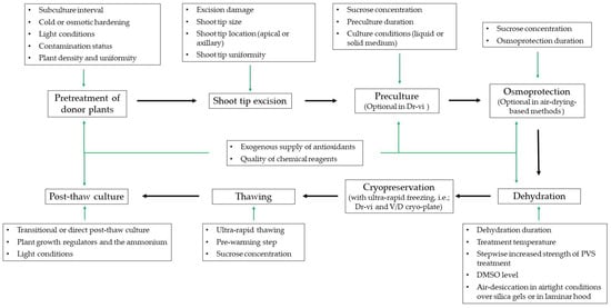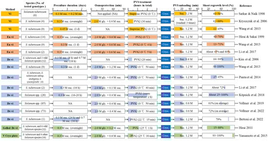 Comparison of major steps of various vitrification solution-based methods for shoot tip cryopreservation in potato [,,,,,,,,,,,,]. Abbreviations: gly, glycerol; man, mannitol; PVS, Plant vitrification solution; suc, sucrose.