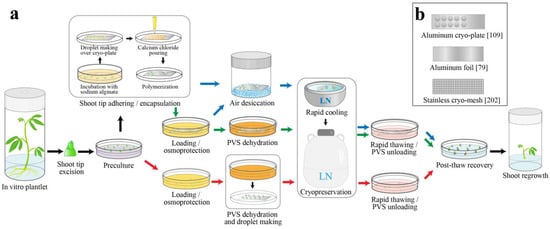 Recently, a new adaptation of the D cryo-plate method has been developed for storage of garlic shoot tips at −80 °C (and not at the usual −196 °C), due to the high glass transition temperatures (Tg) of air-desiccated tissues (−44.7 to −39.4 °C after 90–120 min of dehydration) []. Practically, it is advocated to maintain the cryopreserved material well below the Tg temperature, as the extremely low (almost nil) molecular mobility of the vitrified matrix impedes the formation and growth of lethal ice crystals while inhibiting most ageing reactions. In their protocol, shoot tips were precultured on 1/2 MS medium containing 0.3 M sucrose for 2 days at 25 °C, embedded in alginate drops on cryo-plates, treated by LS with 1.0 M sucrose and 2.0 M glycerol for 30 min at 25 °C, and dried in a laminar flow cabinet for 120 min. Then, the cryo-plates were transferred in 2 mL-cryovial and cooled directly into a deep freezer at −80 °C. For warming, cryo-plates were removed from the cryovials, and placed in ULS (1 M sucrose in 1/2 MS medium) for 30 min at 25 °C. Alginate beads were then detached from the cryo-plates and transferred into the recovery medium. With this protocol, the shoot tip regrowth levels ranged from 91.7 to 100% and averaged at 95.3% across 7 garlic genotypes []. The main advantage of −80 °C storage compared to conventional cryopreservation methods are that it proved possible to use relatively cheap freezers for storage and it is free from the regular supply of LN []. However, more research in the −80 °C storage is needed before this method can apply as an alternative means for the cryopreservation of RTCs [].