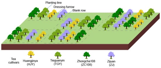 The tea plant cultivars were planted in 2015, in our study, four tea cultivars of Huangjinya (HJY), Tieguanyin (TGY), Zhongcha No.108 (ZC108), and Zijuan (ZJ) were chosen and were planted in a single row, with a plant spacing of 30 cm, a row spacing of 150 cm (Figure 1). Four tea cultivars were selected based on phenotype and growth activity. Each variety per one plot was planted in an area of approximately 36 m2 (12 m × 3 m), with six replicates (plots). The planting density was about 20,000 plants per hectare.