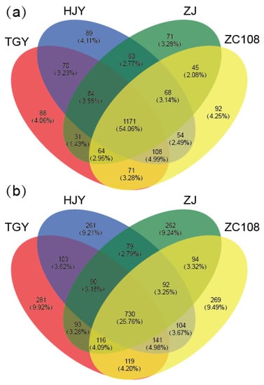 Venn diagram of bacterial (a) and fungal (b) OTUs in the soils with different tea cultivars. HJY, Huangjinya, TGY, Tieguanyin, ZC108, Zhongcha108, ZJ, Zijuan.