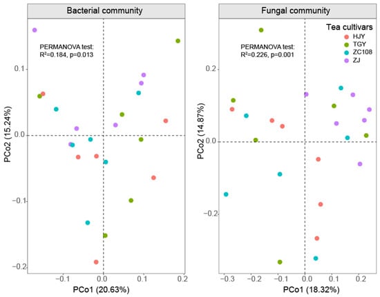 Principal coordinate analysis (PCoA) of bacterial (left panel) and fungal (right panel) community composition at the OTU level based on Bray–Curtis distances. The percentage variations explained by PCoA1 and PCoA2 are shown along the axes. A permutational multivariate analysis of variance (PERMANOVA) was used to determine the significant effect of the tea cultivars.