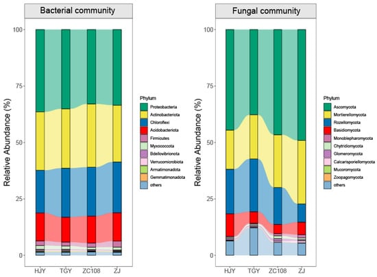 The relative abundance of the top 10 bacterial (left panel) and fungal (right panel) taxa at the phylum levels in the tea plantation soils under four tea plant cultivars. HJY, Huangjinya, TGY, Tieguanyin, ZC108, Zhongcha108, ZJ, Zijuan.