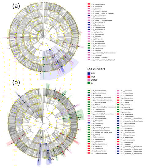 Linear discriminant analysis (LDA) effect size (LEfSe) taxonomic cladogram highlights the bacterial (a) and fungal (b) biomarkers in soils with four different tea plant cultivars. Four tea cultivars included HJY, Huangjinya, TGY, Tieguanyin, ZC108, Zhongcha108, and ZJ, Zijuan. Significantly discriminant taxon nodes are colored and branch areas are shaded according to the highest ranked variety for that taxon. Non-significant discriminant taxonomic nodes are colored yellow. The five rings of the cladogram stand for phylum (innermost), class, order, family, and genus (outermost). Taxa with an LDA score > 3.0 were ultimately identified as the biomarkers.
