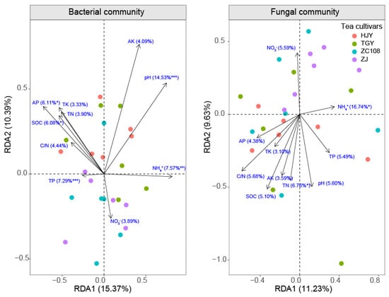 Redundancy analysis (RDA) shows the relationship between bacterial (left panel) and fungal (right panel) community composition and soil properties. The values in brackets represent the explained variation of each soil property in bacterial and fungal community composition. The significance level is indicated by * (p < 0.05), ** (p < 0.01) and *** (p < 0.001) by using a permutational multivariate analysis of variance (PERMANOVA). HJY, Huangjinya, TGY, Tieguanyin, ZC108, Zhongcha108, ZJ, Zijuan.