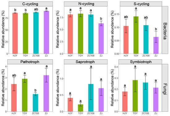 The major functional profiles of bacterial (top panel; C, N, and S cycle by FAPROTAX) and fungal (bottom panel; Pathotroph, Saprotroph, and Symbiotroph by FUNGuild) communities. The data shown are mean ± standard error (SE; n = 6). Different lowercase letters above the bars indicate significant differences (p < 0.05). HJY, Huangjinya, TGY, Tieguanyin, ZC108, Zhongcha108, ZJ, Zijuan.