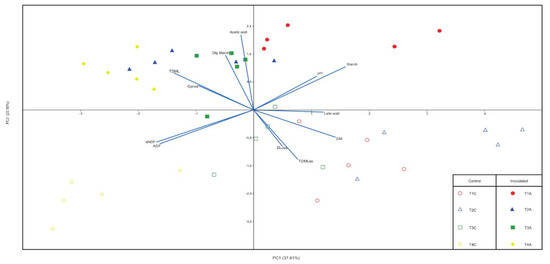 The angle in PCA included between the arrows pointing at two variables determined the correlation between the parameters: sharp angles defined positive correlations, orthogonal angles defined no correlations, and obtuse angles defined negative correlations [29]. pH and starch were positively correlated and delimited the T1A group samples. Those parameters were negatively correlated with NDF and ADF located at the opposite direction, and the latter ones defined the T4C group. Acetic acid and dig-starch were positively correlated and defined the T2A and T3A sample groups, while TDML and GProd defined the T4A group. It is estimated that acetic acid, dig-starch, TDML, and GProd were more affected by inoculation than by the delay periods, as they were mostly influenced by PC2 (Figure 1). A direct and positive correlation was observed between the lactic acid and DM parameters, which along with ELoss and TDMLAS clustered together close to PC1 and defined T1C, T2C, and T3C groups, corresponding to 37.81% of the sample’s variability. Finally, there was a negative correlation between acetic acid production and TDMLAS and ELoss.