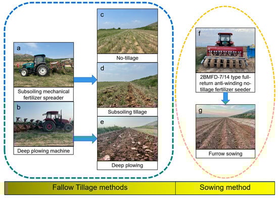 Two fallow tillage machines (a,b), three fallow tillage methods (c–e), sowing machine (f), and sowing method (g).