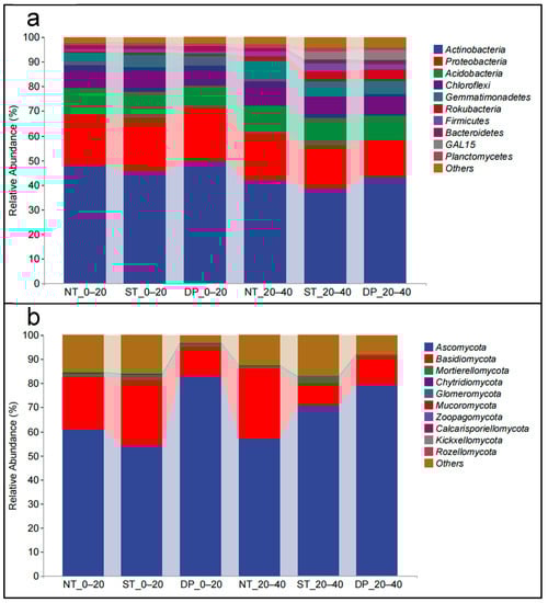 Effect of fallow tillage on relative abundance of phylum taxonomic levels of bacteria (a) and fungi (b) in the 0–40 cm soil layer. NT: no-tillage; ST: subsoiling tillage; DP: deep plowing.