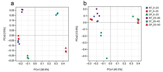 The results of principal coordinate analysis based on Bray–Curtis Distance revealed that there were differences in bacterial and fungal community structures in different soil layers and under different tillage methods (Figure 3). The PCo1 and PCo2 axes explained 36.9% and 15.0% of the bacterial community and 43.3% and 13.9% of the fungal community in the 0–40 cm soil layer, respectively (Figure 3a). In addition, in bacteria, the community composition structure of the 0–20 cm soil layer in NT and ST treatments was similar, and the community composition structure of the 20–40 cm soil layer in ST and DP treatments was similar. Among fungi, NT and ST showed less difference in community structure in the 0–20 and 20–40 cm soil layers.