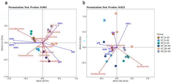 Redundancy analysis of soil physicochemical properties and communities of bacteria (a) and fungi (b) in the 0–40 cm soil layer under fallow tillage (select the top ten species of bacteria and the top three species of fungi). The blue arrows indicate the relative positions of the different environmental factors in the plane, with a longer arrow indicating a more significant effect. The red arrows indicate the relative positions of the major bacterial and fungal communities on the plane. NT: no-tillage; ST: subsoiling tillage; DP: deep plowing.