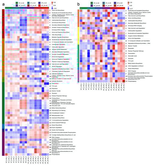 The interactive heatmap shows metabolic functional pathways at level 2 of soil bacterial (a) and fungal (b) communities affected by tillage and soil layer as predicted based on the MetaCyc database. Among the metabolic functions of bacterial communities, the level 1 metabolic pathways are as follows: Biosynthesis: A-L; Degradation/Utilization/Assimilation: M-AB; Detoxification: AC-AD; Generation of Precursor Metabolite and Energy: AE-AU; Glycan Pathways: AV-AW; Macromolecule Modification: AX; Metabolic Clusters: AY-BH. Among the metabolic functions of fungal communities, the level 1 metabolic pathways are as follows: Biosynthesis: A-G; Degradation/Utilization/Assimilation: H-N; Generation of Precursor Metabolite and Energy: O-W; Glycan Pathways: X; Metabolic Clusters: Y-AC. NT: no-tillage; ST: subsoiling tillage; DP: deep plowing.