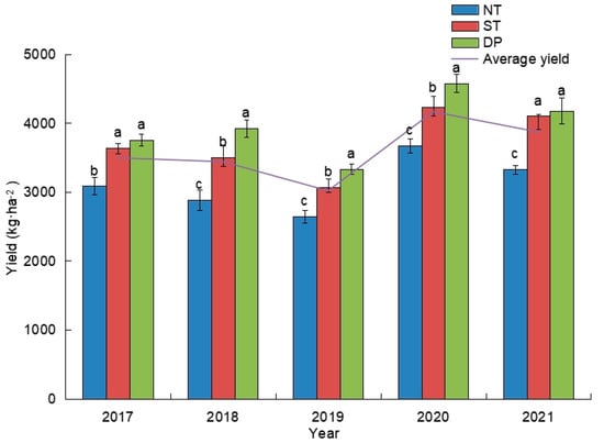 During 2017–2021, compared with NT and ST treatments, DP treatments increased winter wheat yield by 21.78% and 3.29%, 35.92% and 11.99%, 25.78% and 8.49%, 24.60% and 8.04%, 25.55% and 1.86%, respectively (Figure 6). In addition, both ST- and DP-treated winter wheat yields were above average between 2017 and 2021.