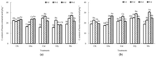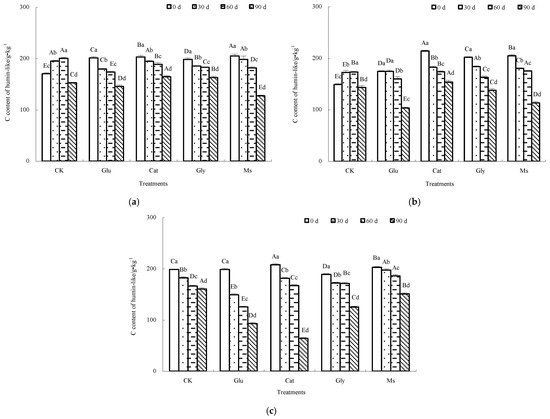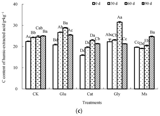 Effect of Maillard reaction precursors on CHLE extracted from the decomposing material of rice straw at three incubation temperatures. Note: significant difference in the different treatments with the same number of incubation days is indicated by different capital letters, and significant difference in the different incubation days under the same treatment is expressed by different lowercase letters. (a) Incubated at 10 °C; (b) incubated at 15 °C; (c) incubated at 28 °C.