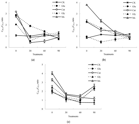 Effect of Maillard reaction precursors on the CHLA/CFLA ratio of the decomposing material of rice straw at three incubation temperatures. (a) Incubated at 10 °C; (b) incubated at 15 °C; (c) incubated at 28 °C.