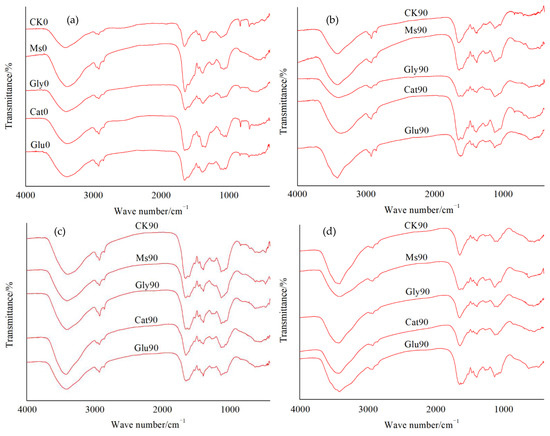 FTIR spectra of HLA extracted from the decomposing material of rice straw at different incubation temperatures: (a) 0 days before the incubation; (b) incubated at 10 °C for 90 days; (c) incubated at 15 °C for 90 days; (d) incubated at 28 °C for 90 days.