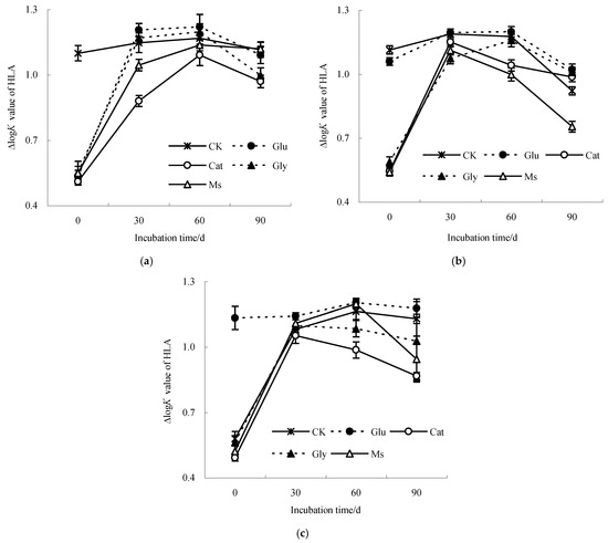 ∆logK value of humic-like acid liquid sample from the decomposing material of rice straw at different incubation temperatures. (a) Incubated at 10 °C; (b) incubated at 15 °C; (c) incubated at 28 °C.