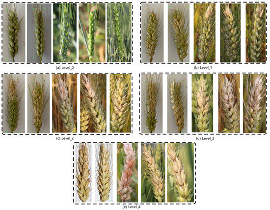 The images acquisition area is Guanzhong district, Shaanxi Province, such as Wugong, Fuping, Pucheng, and Mei County. The image collection time was from 10 May 2022 to 20 May 2022 during late grouting stage of wheat. The shooting equipment include one digital camera (Canon EOS 850D) and mobile phones (Apple 11pro and Huawei Mate20), using automatic white balance and optical focusing. These devices were held 25–50 cm away from wheat ears and the time of acquiring image was from 9:00 a.m. to 18:00 p.m. The images were stored in JPEG format with a resolution of 6000 × 4000 pixels and 4032 × 3024 pixels. To meet the training requirements of the proposed detection model, the image size was uniformly adjusted to the size of 640 × 640 pixels. According to the above standards, we classified the collected dataset into five severity levels of FHB. The dataset contained a total of 2752 images of FHB, including 556 images of Level_0, 638 images of Level_1, 732 images of Level_2, 598 images of Level_3, and 228 images of Level_4. Specific samples of the FHBSGD are shown in Figure 1.