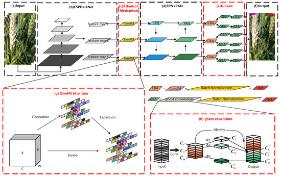 A lightweight network based on improved YOLOX-s, named GSEYOLOX-s (Figure 2), was proposed in this study. To fully minimize the parameters while enhancing the detection accuracy and speed of the classical YOLOX-s, three main strategies were designed in our model. Firstly, the attention mechanism, SimAM, was introduced into the CSPDarknet backbone network of YOLOX-s (Figure 2c) to focus on essential features without additional parameters, which can effectively improve the expressive ability of feature extraction by optimizing an energy function to calculate the contribution of each neuron. Secondly, G-head (Figure 2e) was applied to take full advantage of redundant feature information among similar images, thus greatly reducing parameters and ensuring the performance of the model. In addition, EIoU function was employed for rapid convergence and more accurate localization of wheat ear lesions.