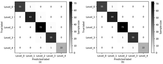 In detail, the mAP of FHB severity grading detection using the six models is shown in Table 5. It can be seen that the mAP of the GSEYOLOX-s was the best among the six models and all above 99% for five FHB severity levels, while the confusion matrixes of YOLOX-s (a) and GSEYOLOX-s (b) on the test set are shown in Figure 5. Among the images of the test set, the YOLOX-s incorrectly predicted one sample for each severity level of FHB. However, the GSEYOLOX-s mis-predicted 1 Level_0 sample, 1 Level_3 sample, and 1 Level_4 sample. All samples in Level_1 and Level_2 were correctly identified. This further demonstrates the outstanding detection performance of our model.