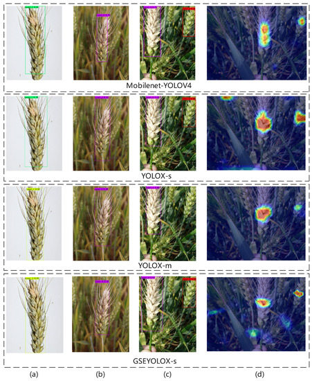 The visual detection results of the top four precision models on FHBSGD are shown in Figure 6, and it can be seen that GSEYOLOX-s outperforms the other comparison models in terms of the accuracy of the grading identification and the prediction of the bounding box for single ear wheat images in column (a) and column (b). For the multi-ear wheat image in column 3, GSEYOLOX-s and Mobilenet-YOLOV4 can accurately detect the severity level of the two wheat ears at the same time, but for the wheat ear obscured partially in column (c), the GSEYOLOX-s detected the severity level of FHB more accurately than Mobilenet-YOLOV4. From the heatmaps in column (d), due to the application of SimAM, the GSEYOLOX-s more accurately focused on the center of the wheat than the other models, making it easier to extract the typical features of FHB. Overall, the comprehensive performance of GSEYOLOX-s was superior to other models in the identification of severity levels of FHB.