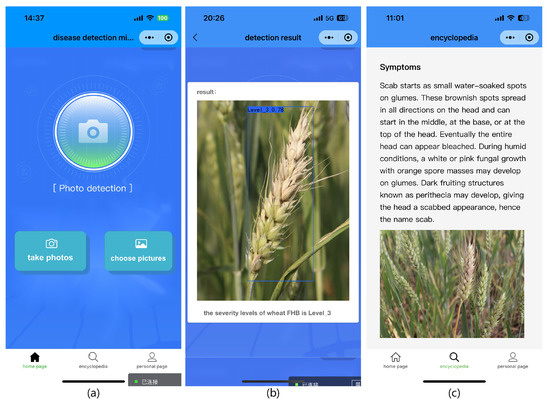 We developed a WeChat Mini Program (Figure 7) to deploy the GSEYOLOX-s model. The service allowed croppers to upload wheat pictures taken in the field or in mobile phone albums (Figure 7a). By using our proposed model on mobile terminals, croppers can easily obtain the real-time feedback to identify the severity levels of FHB (Figure 7b). In addition, some popular science knowledge about FHB was graphically and literally provided in the platform (Figure 7c).