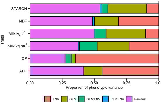 The genotype effect was significant for all traits (Supplementary Table S4). The traits under the greatest genetic control were Milk ha−1 and starch content, which accounted for 31.24% and 30.7% of observed variance, respectively. Genotype accounted for 24.25% of phenotypic variance for Milk ha−1, while the contributions of genetic variance for NDF, ADF, and crude protein content were smaller: 18.9%, 14.62%, and only 3.17%, respectively (Supplementary Table S4; Figure 2).