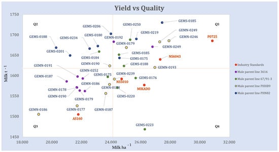 Genotype BLUP values plotted on a Milk ha−1 vs. Milk t−1 plane, which groups genotypes into four distinct quadrants. The dot color represents the male parent of the hybrid. Horizontal and vertical lines represent the grand means for Milk ha−1 and Milk t−1. Commercial check hybrids in the experiment are labeled by green dots.