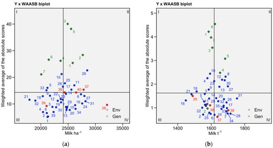 (a) Milk ha−1 WAASBxY plot.; (b) Milk t−1 WAASBxY plot; highlighted in red are industry standards. Environments are represented by greed rhomboids.