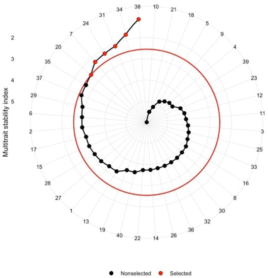 In order to incorporate stability into the breeding goals in a comprehensive manner while avoiding the limitations of traditional methods, we used a Weighted Average of Absolute Scores (WAASB) index []. The WAASB index uses all estimated IPCA that can contain GEI patterns to quantify the stability. The WAASBY index, a superiority index, allowed us to weight performance (Y–a predicted value of a trait) and stability (WAASB index) by comparing the rescaled values of the trait in question and the WAASB index. We used a Multi-trait Stability Index (MTSI) that allows for simultaneous interpretation of results across several traits by considering their mean performance and stability with different weights, and therefore, enables a broader use of the results for diverse breeding goals.