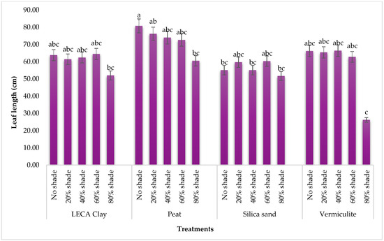 The effect of different growth media and shade levels on leaf length of T. divaricata. Means at the same column followed by the same letter do not differ by Tukey’s test (p > 0.05).