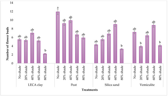 The effect of different growth media and shade levels on the formation of buds of T. divaricata. Means followed by the same letter do not differ significantly by Tukey’s test (p ≤ 0.05).