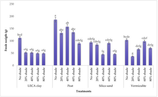 The effect of different growth media and different shade levels on the fresh weight of T. divaricata. Means at the same column followed by the same letter did not differ by Tukey’s test (p > 0.05).