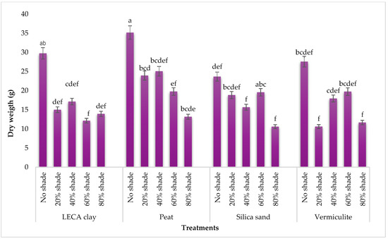 Weight of fresh and dry T. divaricata varied significantly between treatments (Figure 4). The fresh weight was highest in plants cultivated in peat with no shade treatment. This was significantly higher than other treatments but was comparable to plants cultivated in peat under 20–60% shade treatment. The lowest fresh weight was obtained in plants grown in vermiculite under 20% shade. As for the dry weight, the same trend was observed, wherein the highest mean value was again obtained in peat with no shade; this was significantly higher than the control and all other treatments. The dry weight was lowest in silica sand under 80% shade treatment, which was significantly lower compared to the control and other treatments (Figure 5).