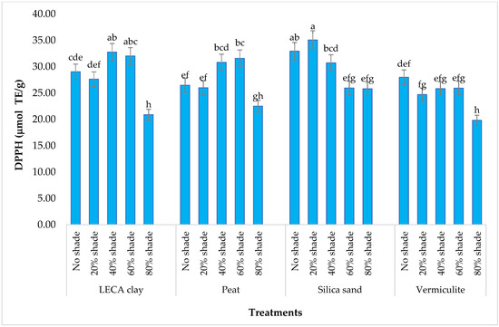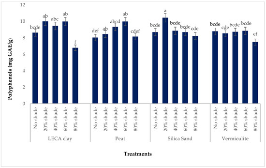 Different growth media and shade levels affected the accumulation of polyphenols significantly in extracted flower buds of T. divaricata (Figure 6). The highest mean value of polyphenols (10.44 mg GAE/g) was recorded in plants cultivated in silica sand under 20% shade. However, this was not significantly different from the values obtained in LECA clay (20% and 60% shade levels) and peat (60% shade level). The lowest polyphenol content was recorded in plants grown in LECA clay under 80% shade, and this was significantly lower than the control and most treatments (Figure 6).