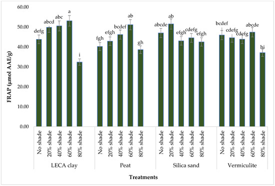 Fruits and vegetables with high antioxidant capacity add value to food products and are well received by consumers and the food industry [74]. Consumption of plant products high in phenolic content can protect human tissue oxidation by scavenging free radicals and inhibiting lipid peroxidation, thereby improving nutritional quality, and avoiding potential problems caused by excessive consumption of synthetic additives [75]. As a result, it is critical to enhance the phytochemical components of fruits and vegetables during cultivation. One of the most important environmental variables in regulating vegetable growth, development, and phytochemical accumulation is light condition (light quality, light intensity, and photoperiod), which is especially important for vegetables grown in controlled environments [76]. In the present study, the flower buds of plants grown under 20% shade had higher polyphenols than other treatments, while the media had no significant effect on the accumulation of polyphenols. This supports the findings of [6] on Tulbaghia violacea flower stalk, where low light intensity increased the polyphenols. On the contrary, the flavonol compositions among light intensities were variable. This contradicts the results of [77] on broccoli microgreens where high light intensity increased the flavonol content. Nevertheless, the antioxidant capacity was increased in plants grown in LECA clay and peat under 40 and 60% shade, except TEAC. These results show that light intensity and growth media may affect not only plant yield but also the synthesis of other biologically active substances, such as phenolics, which have a protective role against induced stress responses [78].