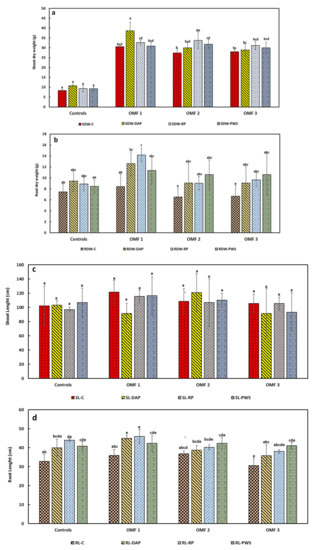 Effect of OMF formulations on plant agro-physiology parameters; (a) shoot dry weight (SDW), (b) root dry weight (RDW), (c) shoot length (SL), and (d) root length (RL). Results represent the means (± standard deviation) of five replicates. Different letters are significantly different according to Tukey’s test at p < 0.05.