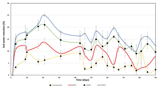 Globally, the curve variations (Figure 3) showed two different periods of water retention that were well distinguished, in which the first one (late spring, <40 days) was characterized by a higher water retention capacity. After 9.21- and 31-day growth experiments, the addition of OMF1, OMF2, and OMF3 allowed an increase in the soil water retention to an average of 11.7%, 17%, and 20% compared with the unamended controls, respectively. However, this retention capacity decreased during the second phase (summer period, >40 days) to 8.8%, 12.7%, and 16.7% for OMF1, OMF2, and OMF3, respectively.