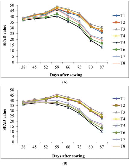 The analysis of variance showed that mean squares due to variety (V), salinity (S), salicylic acid (SA) and their interactions were significant (p ≤ 0.05 or p ≤ 0.01) for chlorophyll content (SPAD) at different days after sowing (DAS) (Table 3). The SPAD value of wheat leaves increased with the passage of time up to 59 DAS, then declined gradually (Figure 1A,B). At 59 DAS, the maximum SPAD value for G 200-4 (50.0) and BARI gom-25 (46.0) were found with 1.0 mM SA application. However, salinity significantly reduced the formation of chlorophyll in both the genotypes. On the other hand, the application of SA enhanced the SPAD value of saline-stressed wheat genotypes. During the combined application of salinity and SA, the maximum SPAD value for G 200-4 (46.0) and BARI gom-25 (41.0) were observed with the T7 (12 dSm−1 NaCl + 1.0 mM SA) treatment at 59 DAS of wheat.