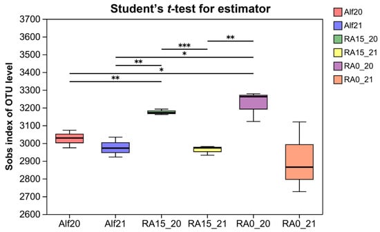 The soil samples were analyzed for bacterial diversity based on high-throughput sequencing. The corn insertion significantly affected the Sobs index (Figure 1). RA15_20 and RA0_20, and RA15_21 and RA0_21 showed no significant change in bacterial diversity, which revealed that nitrogen fertilizer in the alfalfa–corn system had nearly no effect on the bacterial α-diversity. However, in 2020, the Sobs index of RA0 and RA15 with the corn insertion was significantly higher than that of AF0. For RA0 and RA15, the bacterial diversity significantly decreased in 2021 compared to 2020 (p < 0.05).