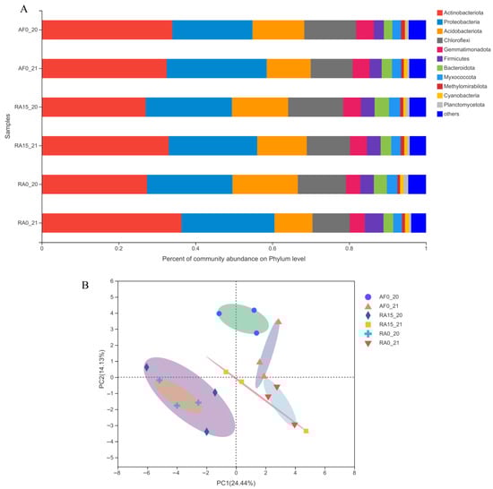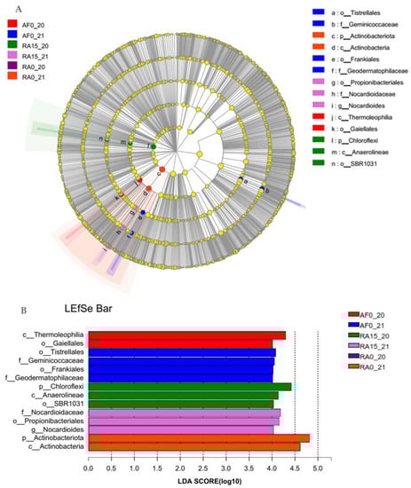 To determine the classified bacterial taxa with significant abundance differences among the six treatments, LEfSe analysis was performed at LDA scores > 4. The results revealed that Thermoleophilia (class) and Galellales (order) had higher relative abundance in AF0_20; Tistrellales (order), Geminicoccaceae (family), Frankiales (order), and Geodermatophilaceae (family) were enriched in AF0_21; Nocardioidaceae (family), Propionibacteriales (order), and Nocardioides (genus) were enriched in RA0_20; Actinobacterota (phylum) and Actinobacteria (class) had higher relative abundance in RA0_21; and Chloroflexi (phylum), Anaerolineae (class), and SBR1031 (order) had higher relative abundance in RA15_20 (Figure 3A,B).